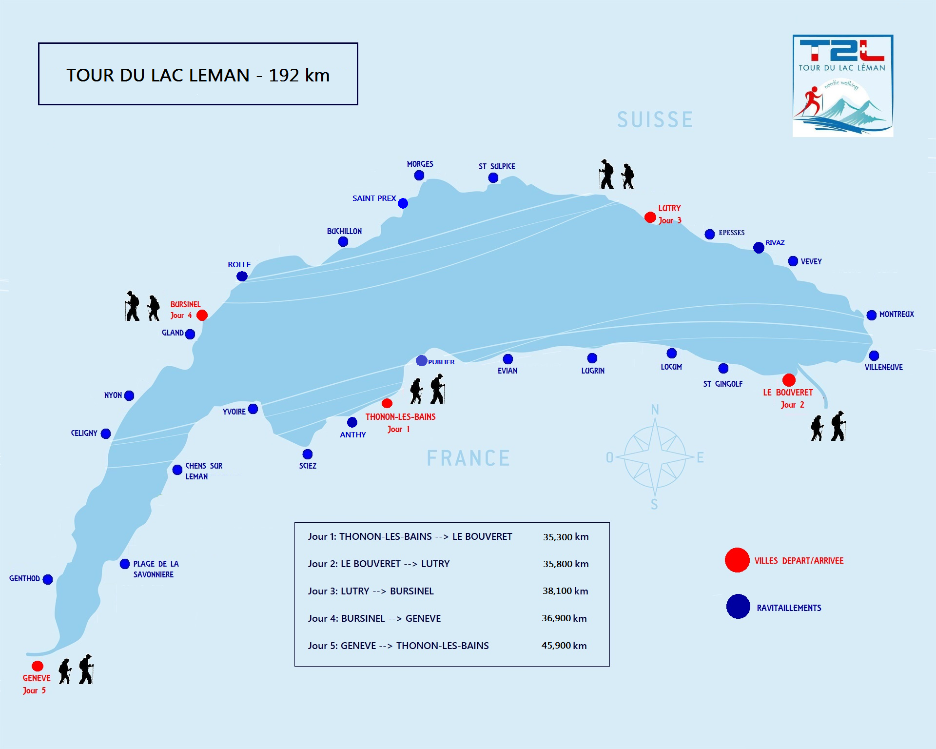 Créé en 2011, le T2L – Tour du Lac Léman – accueille chaque année une centaine de passionnés de marche nordique et de randonnée pour 5 jours itinérants. A ce jour, avec ses 200 kms, c’est le parcours le plus long proposé en Europe. Au programme, des allures et des distances au choix : 80, 120 ou 192 kms avec des étapes permettant de découvrir les plus beaux sommets entre Léman, Mont-Blanc et Jura.