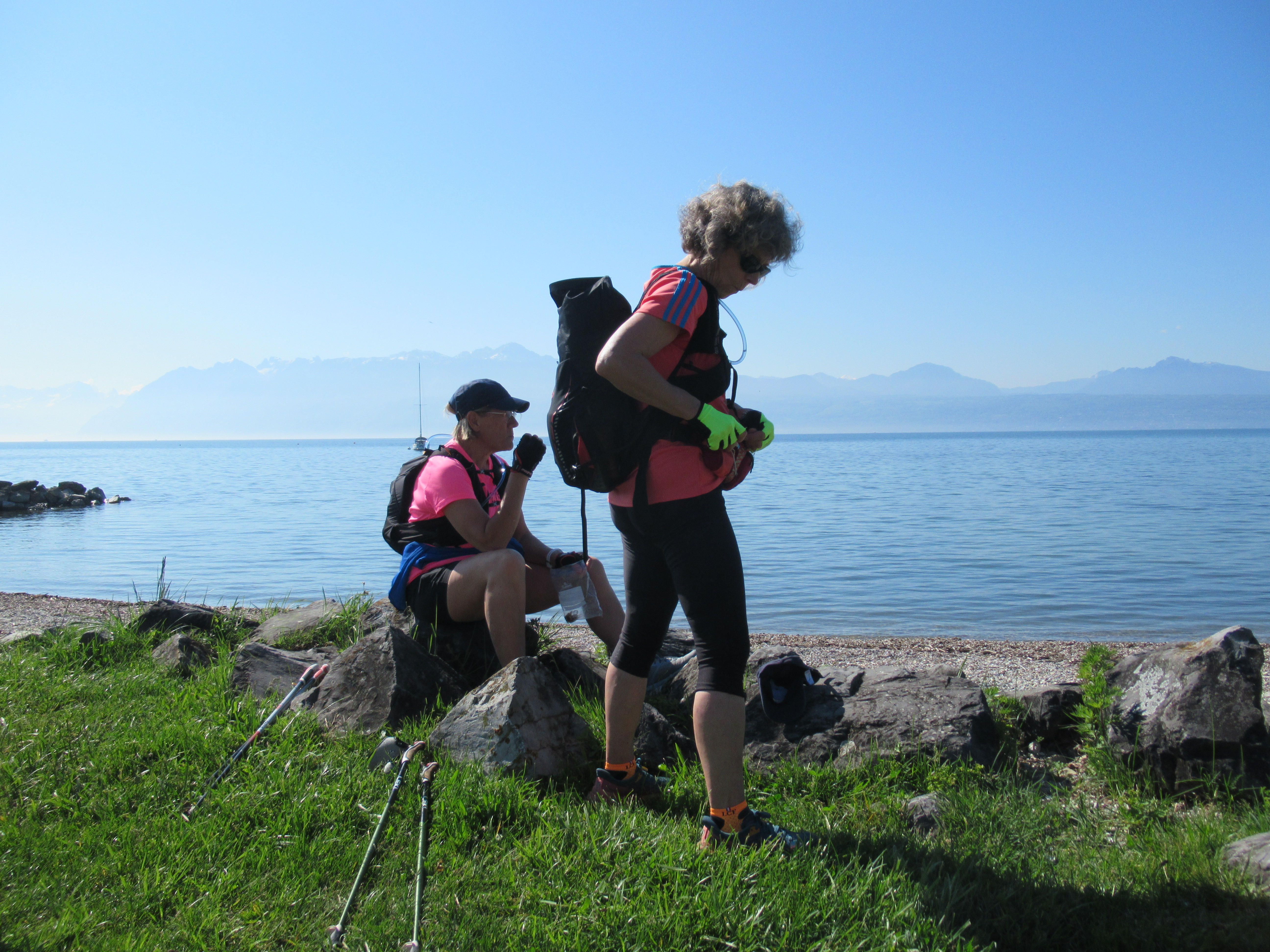 Les marcheurs arrivent à l’étape entre 16 et 18h : récupération des sacs, installation dans les chambrées, douche, visite chez le masseur, chez le podologue qui pique, pose des strapping, éosine les pieds blessés, et détente quand il reste un peu de temps, diner et couchage. Dire que les nuits ont été réparatrices serait exagéré puisque le groupe est logé dans des abris antiatomique Suisse, expérience inédite pour tous. L’ambiance est bon enfant mais peut être explosive, étroitesse des lieux, ronflements, sifflements, déménagements, claustrophobie, une certaine a fini les nuits à l’extérieur et par chance sous les étoiles. L’auberge de jeunesse à Genève pour la dernière nuit, nous a semblé très confortable et a offert à d’autres une anesthésie générale.